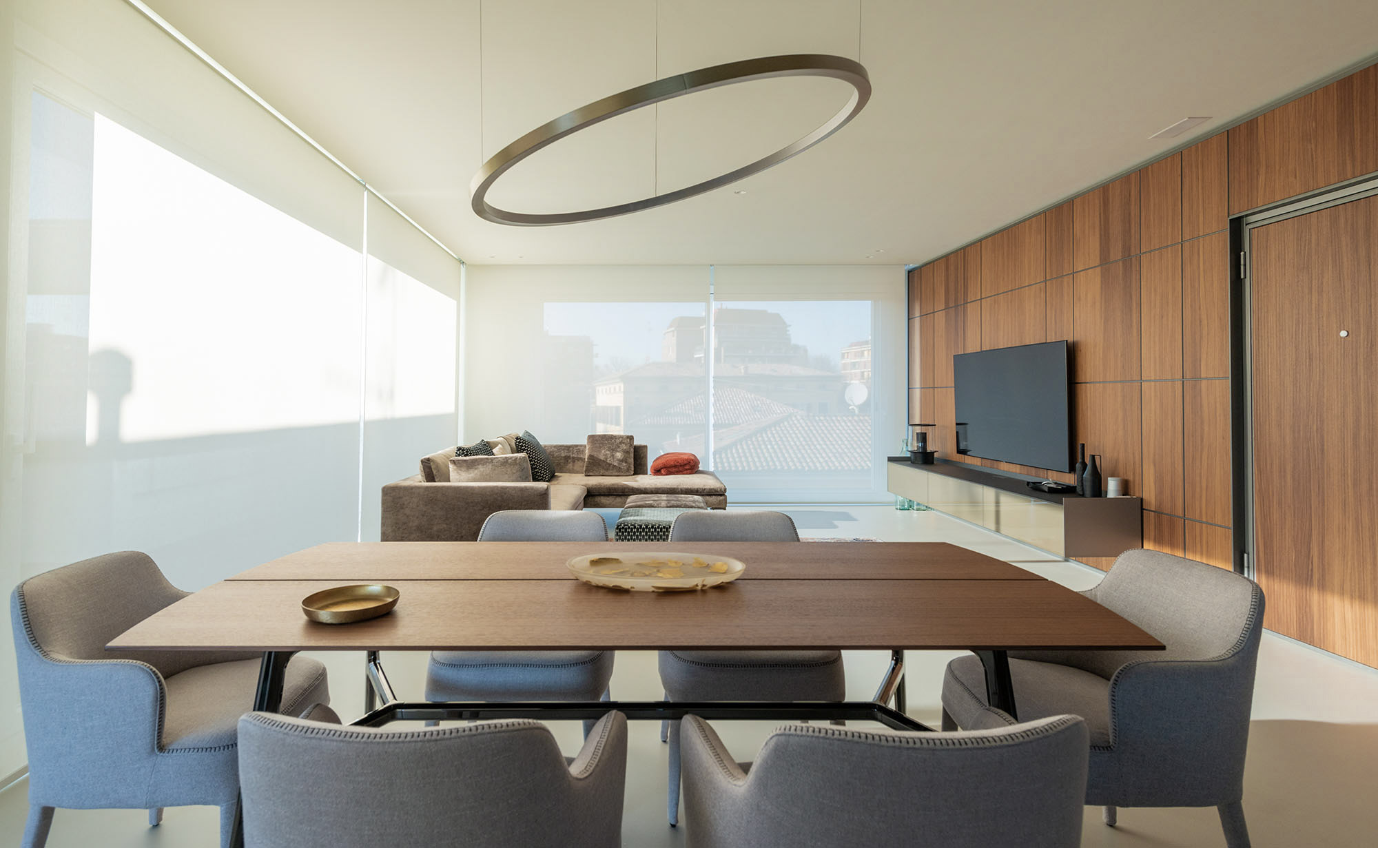 Le boiserie in legno sono le protagoniste indiscusse di questo splendido attico, caratterizzato da una grande ricerca nei materiali e progettato per ottimizzare al massimo lo spazio, attraverso architetture modulari e che permettono il passaggio naturale della luce, rendendo l’ambiente moderno ed elegante.